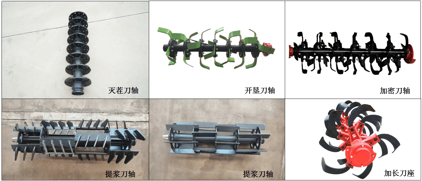可根據水旱田及農藝需要配制:滅茬刀軸、開墾刀軸、提漿刀軸、加密刀軸、提漿刀軸、加長刀座
